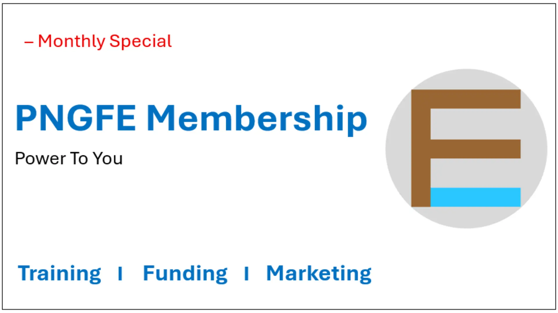 PNGFE Membership is your gateway to Training, Funding, Market Access, and Premium E-Services, giving you full access to all PNGFE opportunities. As a member, you gain unlimited training to turn crops, livestock, and small industries into high-value products, eligibility to apply for project funding through our crowdfunding portal, and direct access to buyers via our trusted online marketplace. With PNGFE certification, your products earn recognition locally and internationally, while our premium e-services—ranging from E-Wallet and E-Job Board to E-Health, E-Registration, and more—equip you for success. Simply Sign Up, Train, Fund, Sell, and Benefit as you grow with PNGFE.